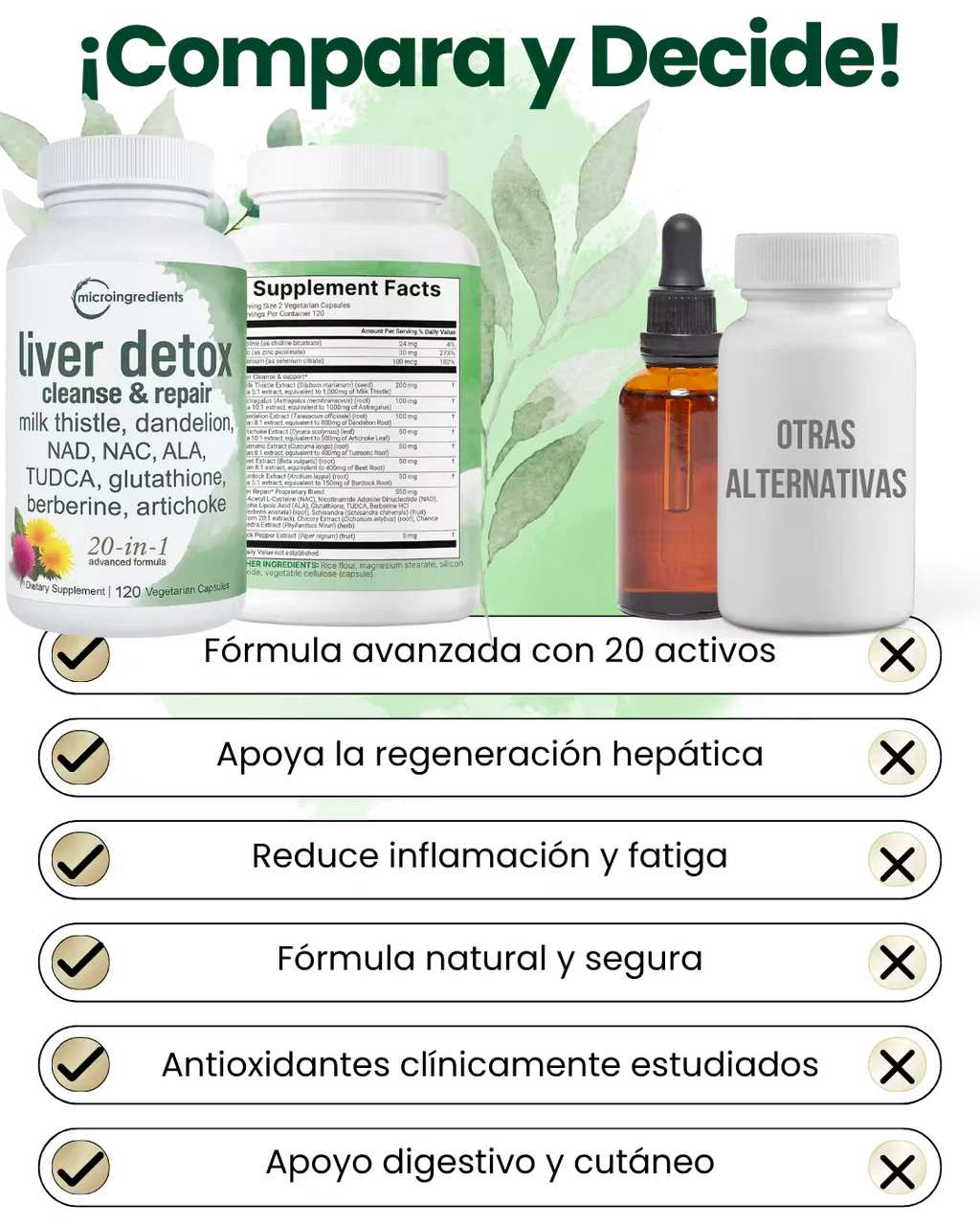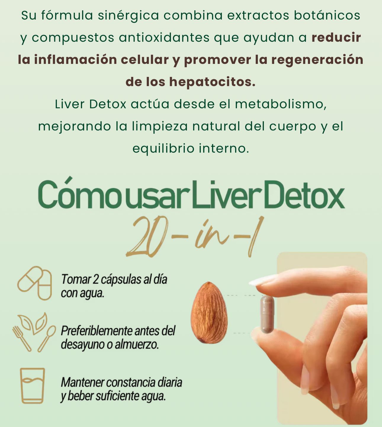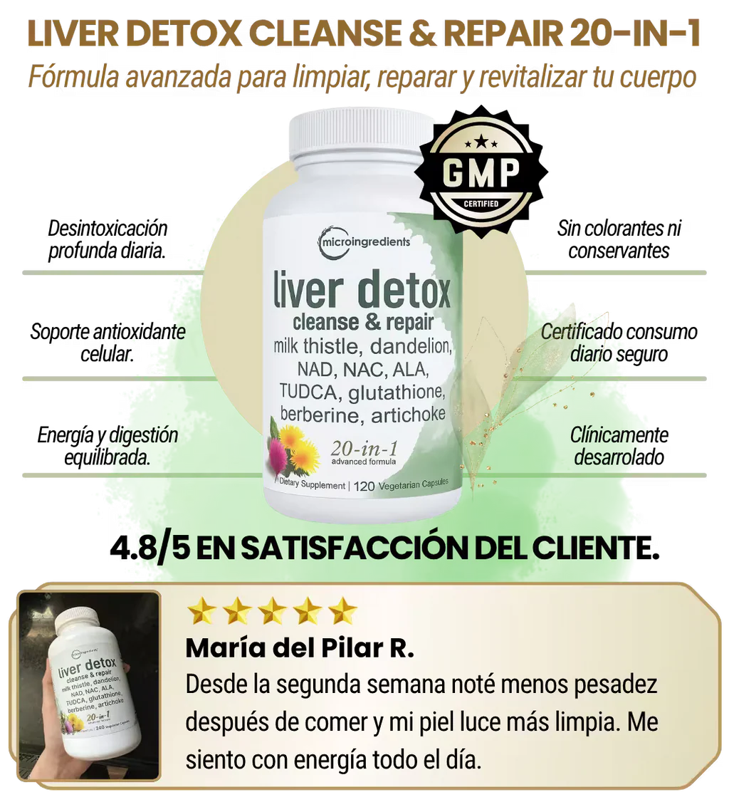 Amanecía casi todos los días con sensación de náusea y la boca amarga, como si hubiera comido pesado en la noche aunque no fuera así. Desde que empecé con el Liver Detox esa sensación disminuyó muchísimo. Duermo más tranquila, ya no me despierto con ese malestar en el estómago y siento menos acidez. Me gustó que vino bien sellado, con su fecha de caducidad clara y la tienda me avisó por WhatsApp hasta que lo recibí.